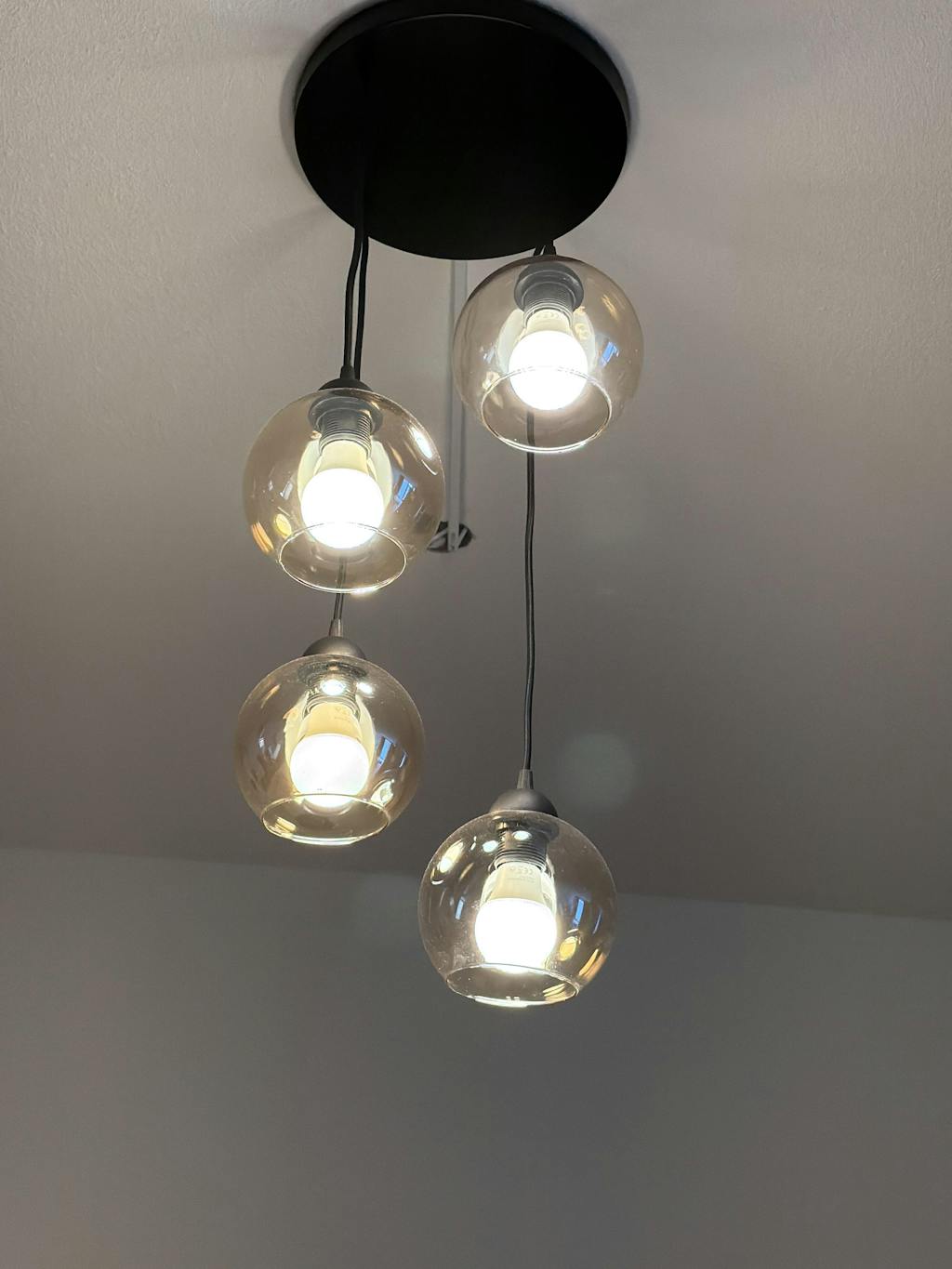 Met de juiste gloeilampen erin: een prachtig resultaat! Wij hebben er 2W filament LED bollampjes in gedaan, 2700 K; dus mooi warm licht in combinatie met de amberkleurige glasbollen. De snoeren zijn lang genoeg voor de meeste toepassingen (laag tafeltje), maar ook eenvoudig in te korten boven een eettafel.