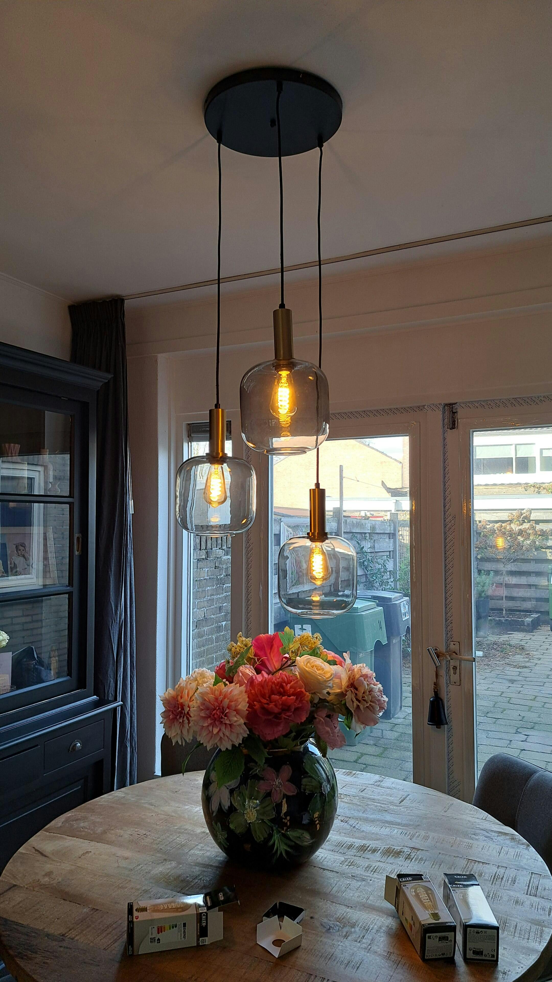 Een perfecte keuze als hanglamp zwart met messing en smoke glas boven de eettafel, in de woonkamer of boven een keukeneiland. De smoke glazen bollen zorgen voor een gedempte, warme lichtgloed – ideaal voor gezellige avonden.