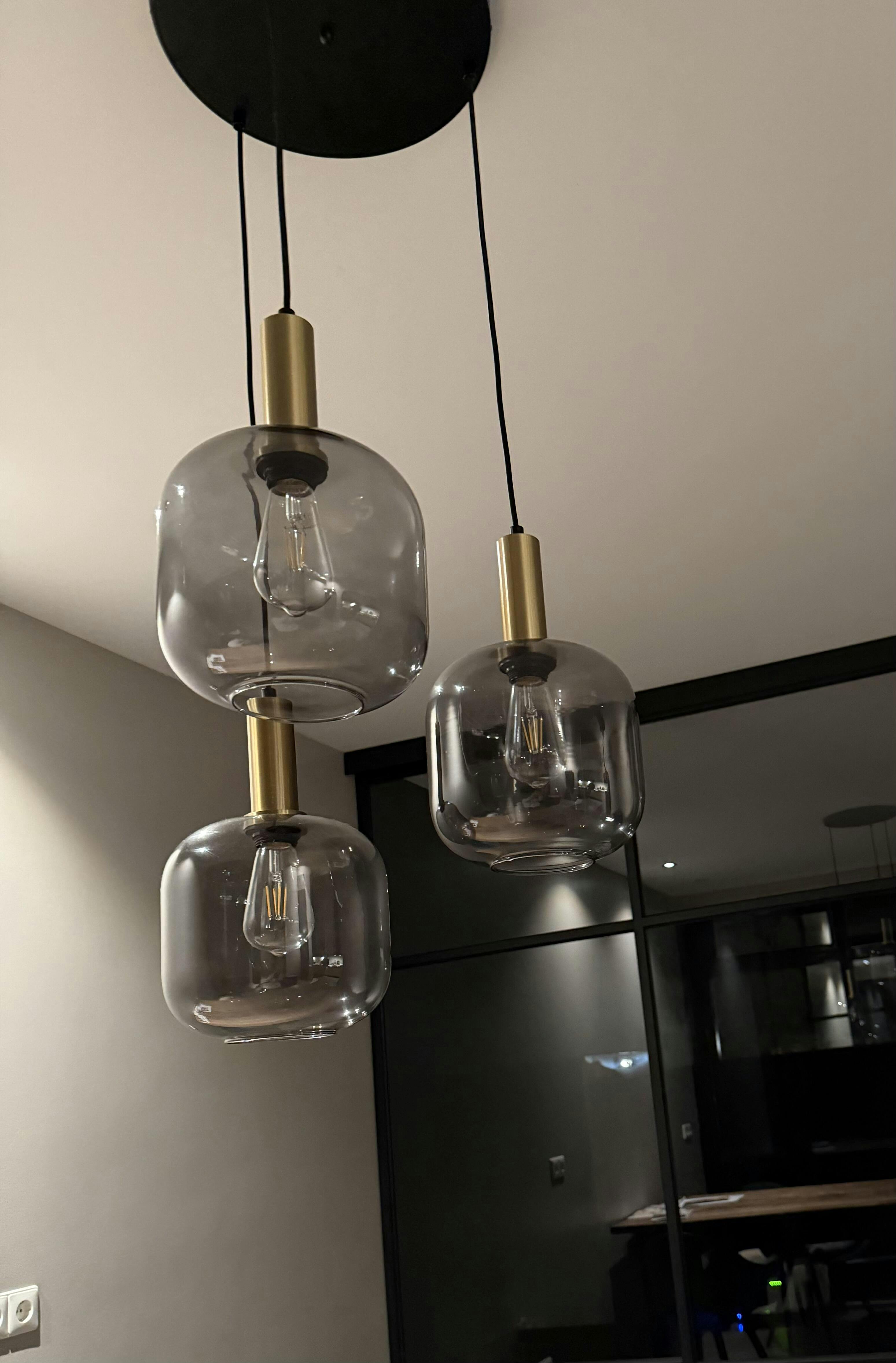 Deze luxe 3-lichts hanglamp combineert matzwart staal met warme messing accenten en stijlvolle smoke glazen kappen. De combinatie van kleuren en materialen zorgt voor een chique uitstraling en een zachte, sfeervolle lichtverspreiding. De drie hangpunten zijn op verschillende hoogtes geplaatst voor een speels en elegant effect.