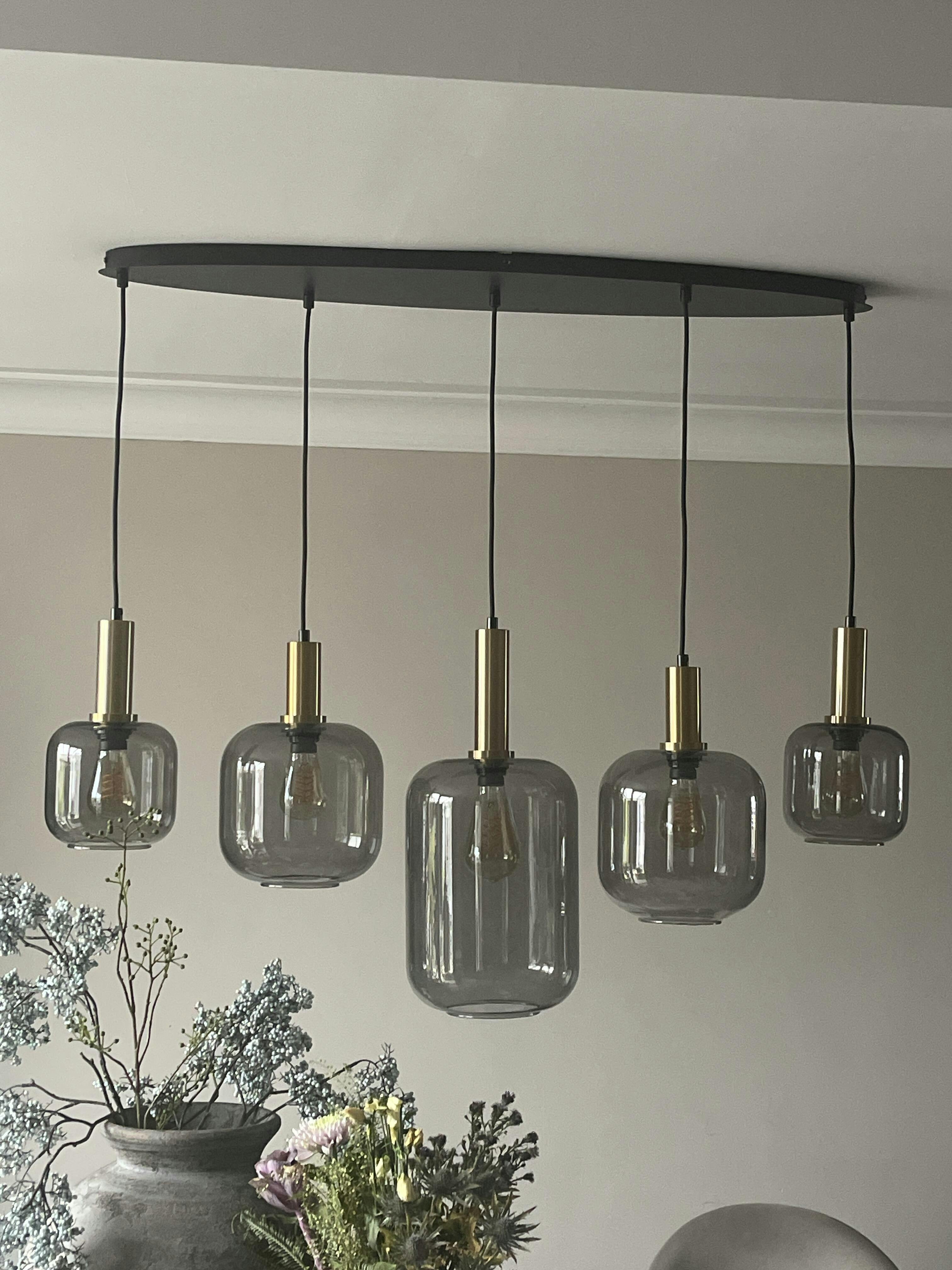 Hanglamp ovaal – zwart met gouden accenten en smoke glas, 5-lamps