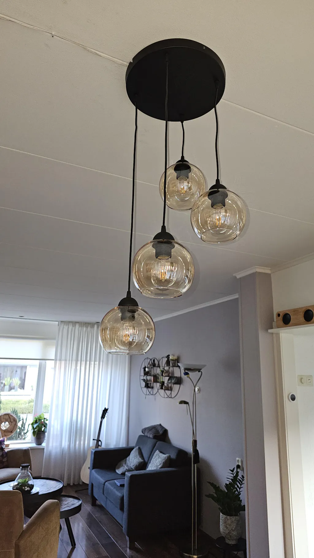 Geef jouw ruimte een stijlvolle upgrade met deze 4-Lichts hanglamp met smoke glazen bollen en strak zwart design.