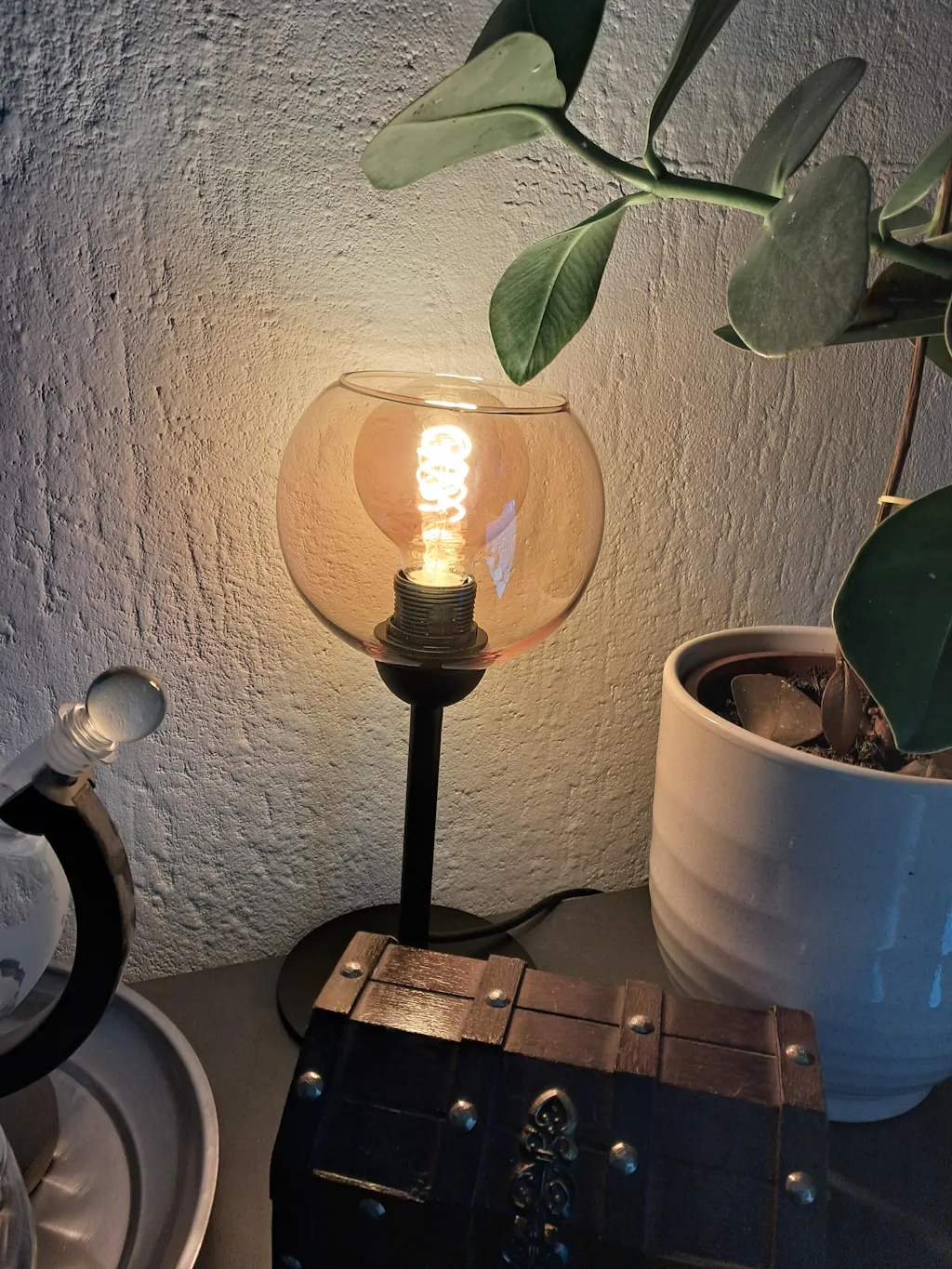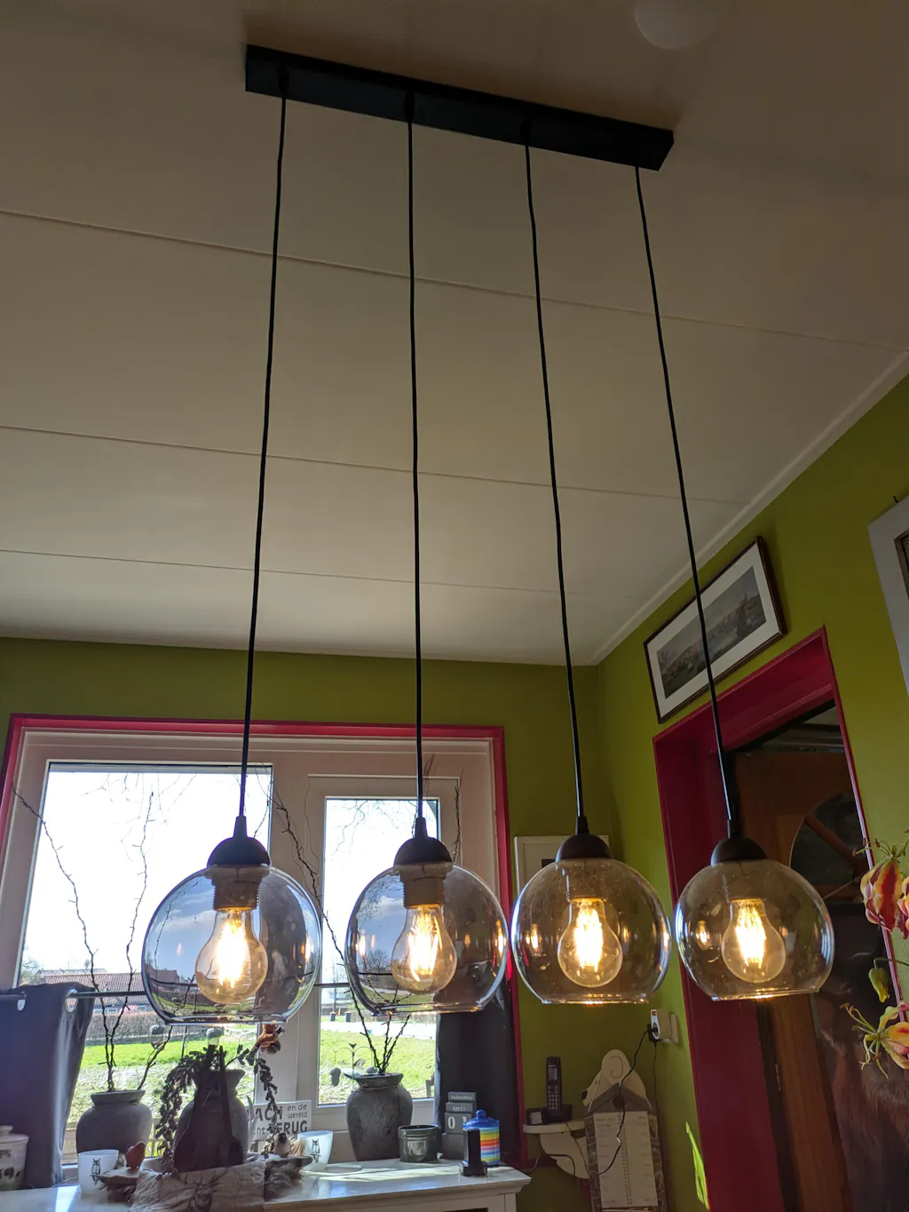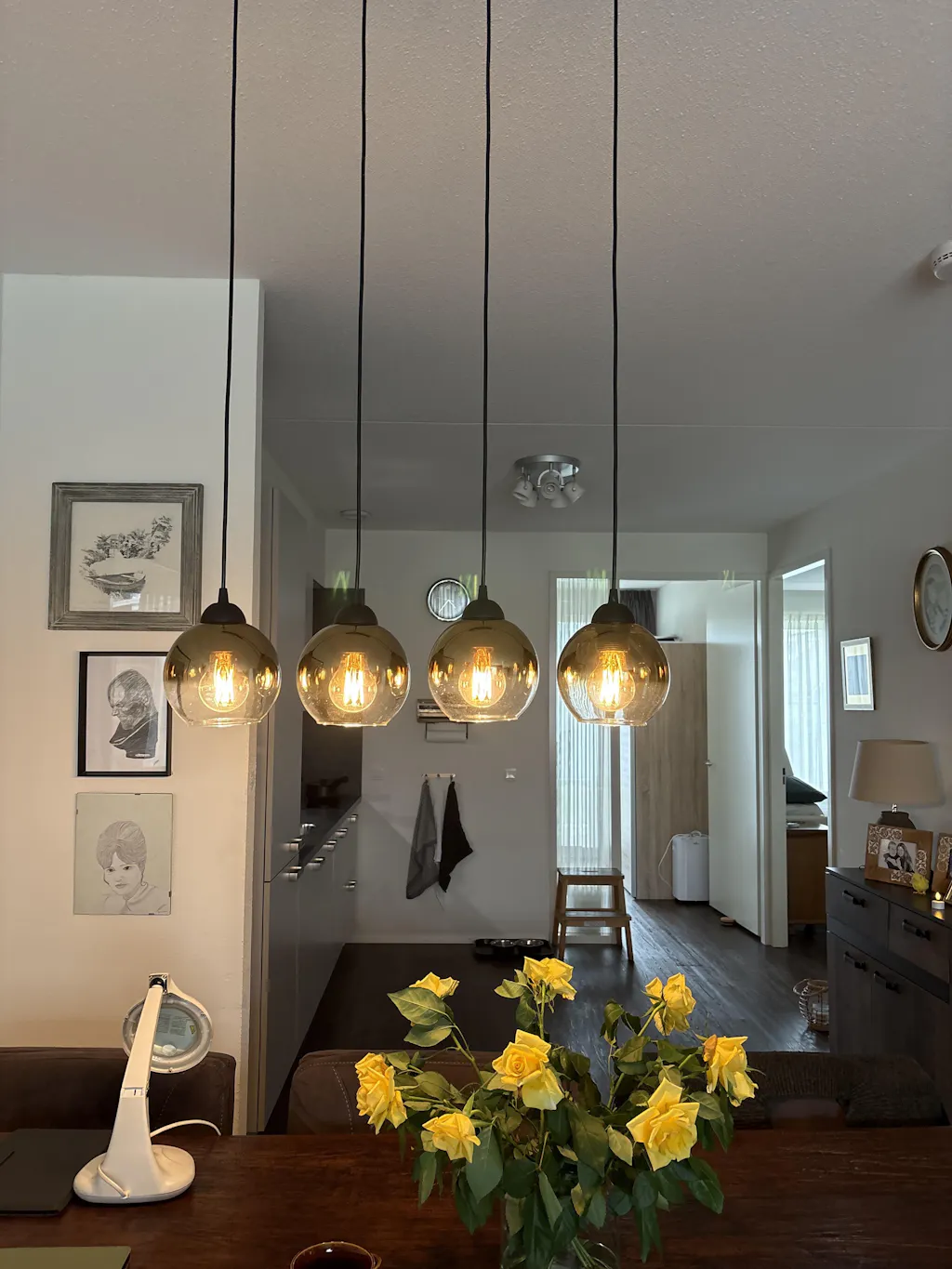 De smoke glazen kappen verspreiden het licht op een zachte en sfeervolle manier.